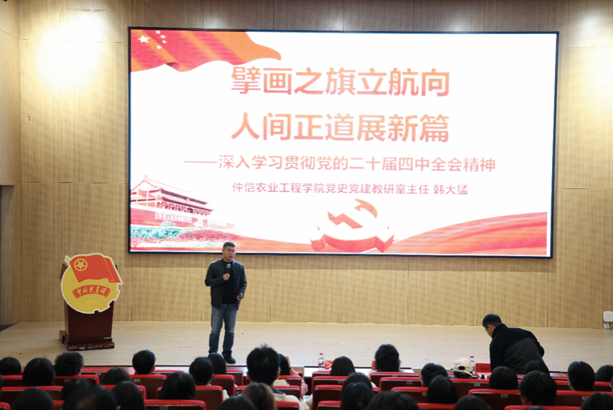 本次宣讲会特邀我校马克思主义学院韩大猛老师作题为《擘画之旗立航向  人间正道展新篇》的专题讲座。报告紧扣党的二十届四中全会的时代背景、核心要义和实践指向,系统阐释了全会在推进国家治理体系和治理能力现代化中的重大意义,深入解读了新时代坚持和完善中国特色社会主义制度的理论逻辑、历史逻辑与现实逻辑。