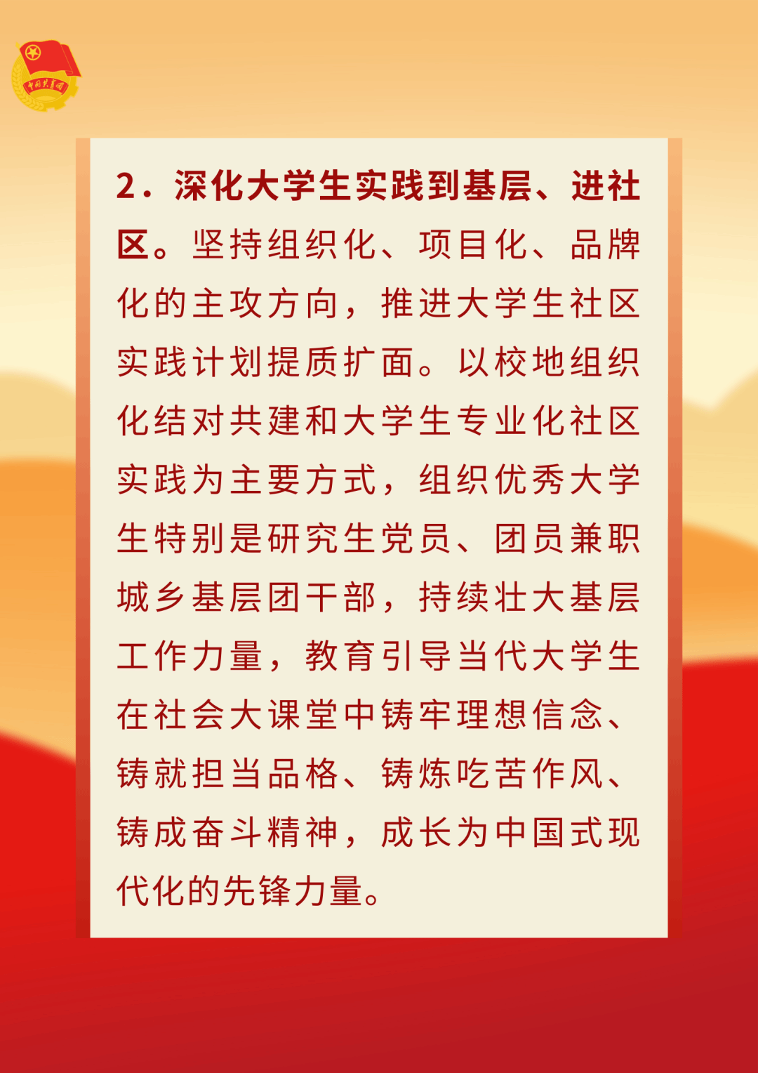 2024年,要着力抓牢高校重点,大力促进学校团组织发挥主力军作用,主要有6方面工作。