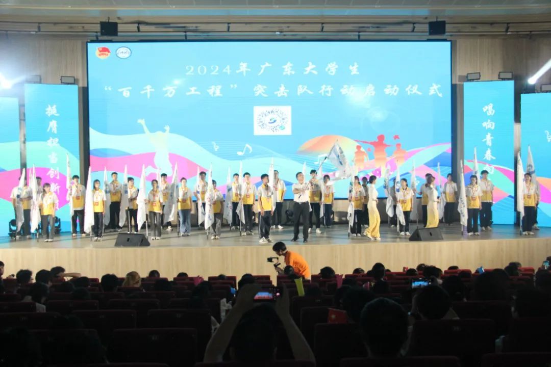 广东大学生“百千万工程”突击队行动启动仪式展示了我校2023年在奋力推动广东省“头号工程”中贡献的青春力量与取得的可喜成果,以及当前工作进展。宋垚臻为突击队代表授旗。现场,代表们挥舞手中的旗帜,猎猎作响的风声传达着他们用脚步丈量祖国河山,将论文写在乡村大地的无畏决心。