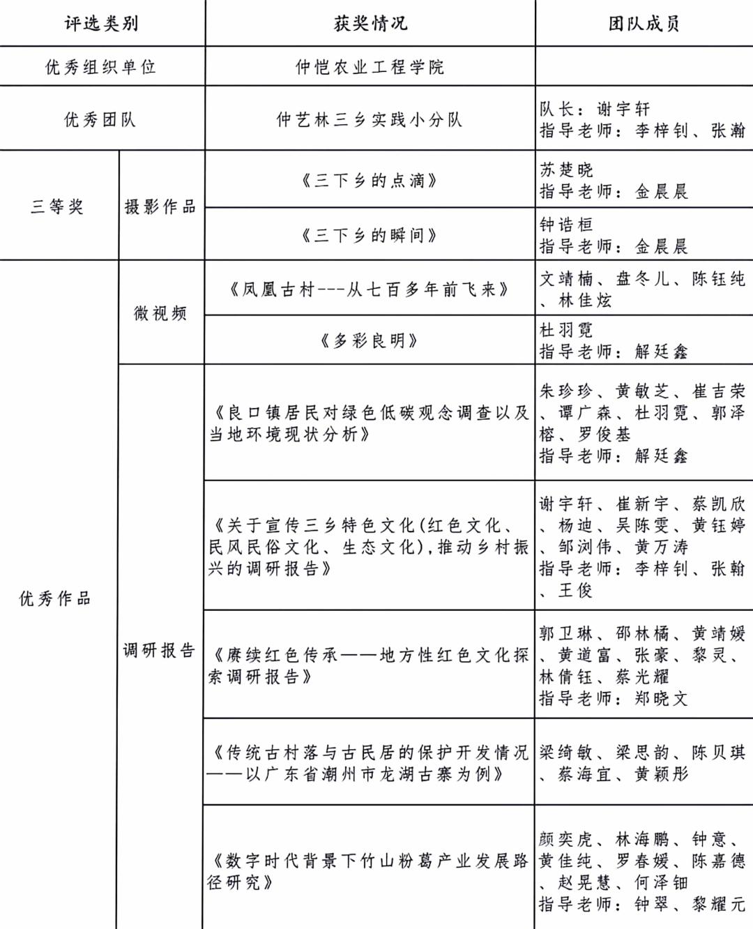 近日,由广东省人民政府地方志办公室、广东省精神文明建设委员会办公室、中共广东省委港澳工作办公室、广东省教育厅、广东省科学技术厅、广东省农业农村厅、共青团广东省委员会、广东省学生联合会、南方报业传媒集团联合组织开展的“讲村史、展村史、传村史”2023年多彩乡村系列实践活动表彰结果公布,我校共获奖11项,其中学校获评“优秀组织单位”,1个团队获评“重点团队”,2个作品获三等奖,7个作品获评“优秀作品”。去年,校团委积极组织动员我校师生参与“百千万工程”突击队行动,以团队形式参与活动的师生有700多名,分别奔赴省内各地市开展农产品推销直播、环保宣讲、推广普通话、美丽乡村墙绘等“三下乡”实践活动,办实事、显实效,不断助力“百千万工程”高质量发展。未来,校团委将继续引导广大青年在社会实践中受教育、长才干、作贡献,为广东省加快发展新质生产力,扎实推动高质量发展贡献仲恺青春力量。
