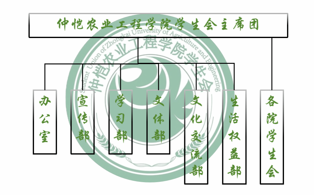 仲恺农业工程学院学生会(简称“校学生会”)是在学校党委领导下,校团委和省学联的悉心指导下,代表广大同学利益的全校群众性自治组织。校学生会始终坚持“团结、务实、进取、服务仲恺人”的宗旨,以全面提高同学综合素质为中心,紧紧围绕学校党政中心工作,开展各种丰富多彩的校园活动,团结和带领广大同学在学习和实践中成长成才。我校学生会曾获“广东省优秀学生会”荣誉称号。