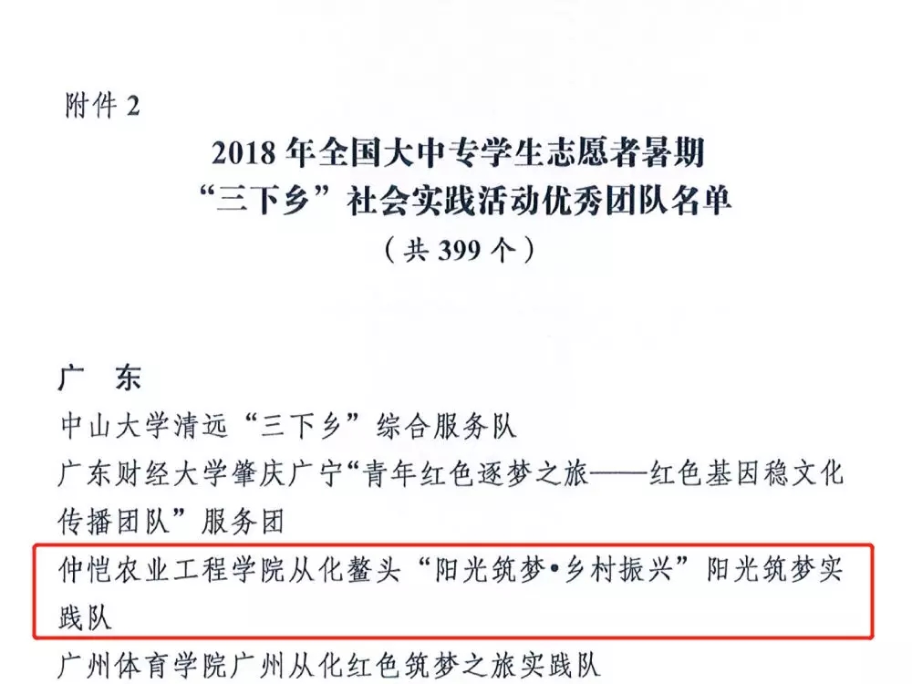 近日,团中央学校部发布《2018年全国大中专学生志愿者暑期“三下乡”社会实践活动总结通报结果公示》。经系团总支申报、学院团委审核、团省委推荐、专家评审等环节,最终评选出全国优秀实践团队399个,我校自动化学院“阳光筑梦·乡村振兴”阳光筑梦实践队荣获全国优秀团队。