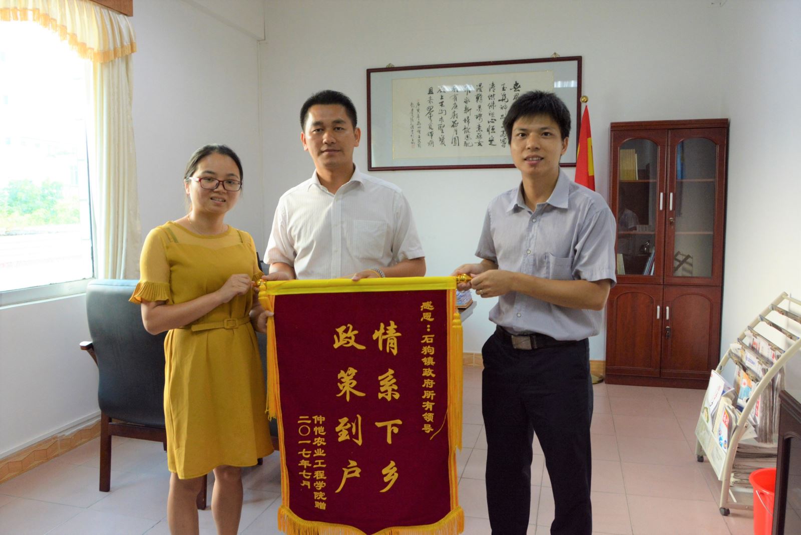 下午,王品老师和李昌辉老师带领三下乡成员来到石狗镇政府,将一面绣有“情系下乡,政策到户”的锦旗送到石狗镇党委书记钟传锋手中,以感谢石狗镇政府对我校两院暑期社会实践活动的大力支持。钟书记表示希望跟仲恺农业工程学院在社会实践、教学实习、科研项目等方面进一步深化合作,也欢迎师生们再次过来石狗镇。