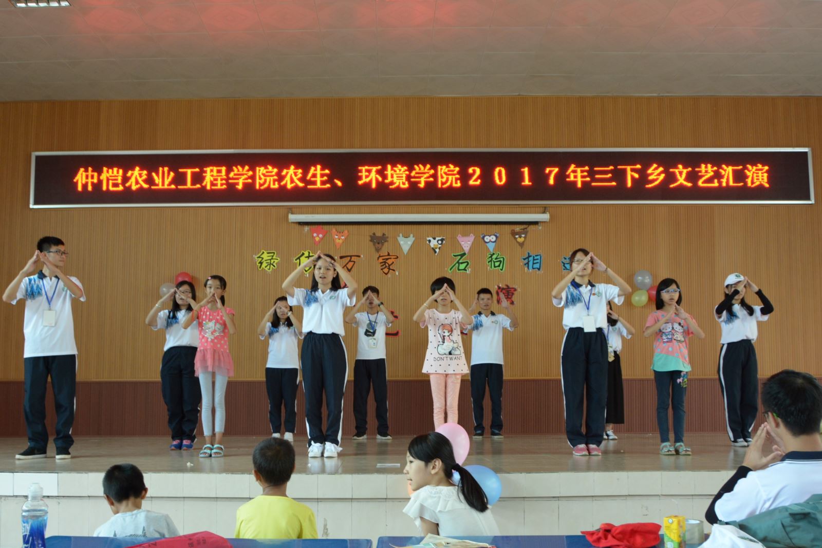 恰逢四会市创建全国文明县级城市之际,两院的三下乡成员在石狗学校举行2017年暑期“三下乡”文艺汇报演出。汇演以“文明四会,相逢石狗”为主题,以歌舞表演为主线,队员们和小朋友们同台共欢,给当地群众带来了一场精彩的文艺演出。