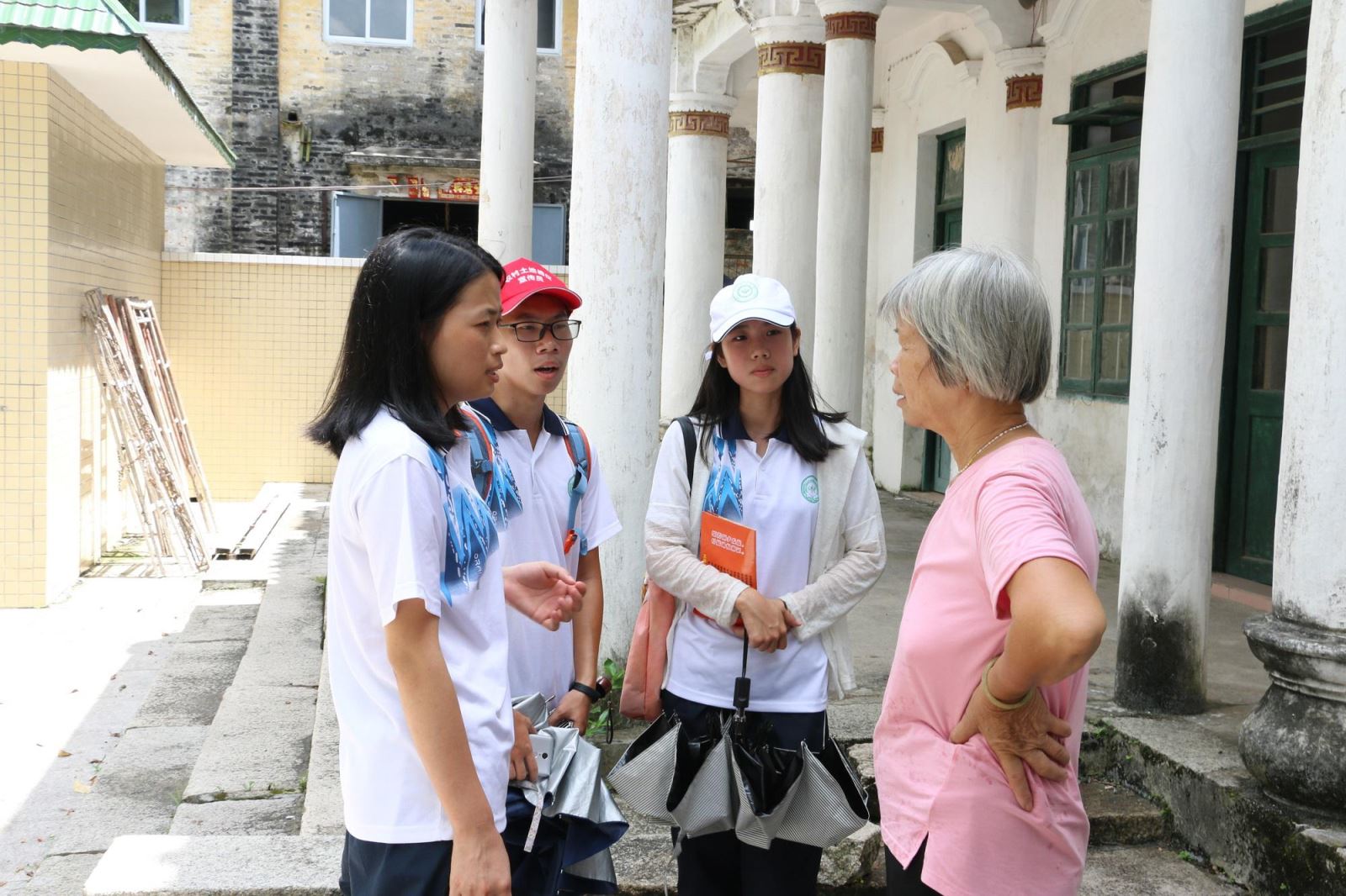 为了完善梁启超文化对新会茶坑的影响的调研,调研组一大早就迈开了寻找名人旧迹的脚步——实地调研梁启超长子梁思成先生1962年回乡时,在茶坑现场主持设计的旧乡府。根据本地村民的指示,沿着走了七天的熟悉的乡间小巷,挥洒着属于夏天烈日下的汗水,我们终于来到了这座中西合璧、颇具侨乡风情的旧建筑跟前。一位住在旧乡府附近的老奶奶带我们上楼参观建筑内部结构,并且告诉了我们关于这个旧乡府的历史,组员们详细做好访谈记录。