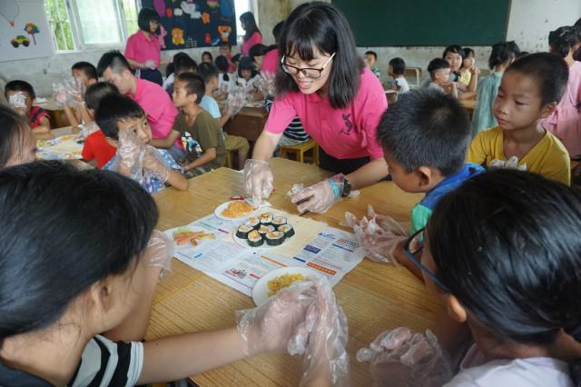 与此同时,小班的小朋友们则在第一堂课上都成了“中华小当家”。队员们和小朋友们一起做寿司。在队员们的协助下,小朋友们成功制作了太卷寿司和军舰寿司,小朋友们不仅是“中华小当家”,也成了艺术家。在享用了漂亮又美味的寿司后,小朋友们露出了满足的神情,队员们则以 “珍惜粮食”作为第一堂课的结课语。