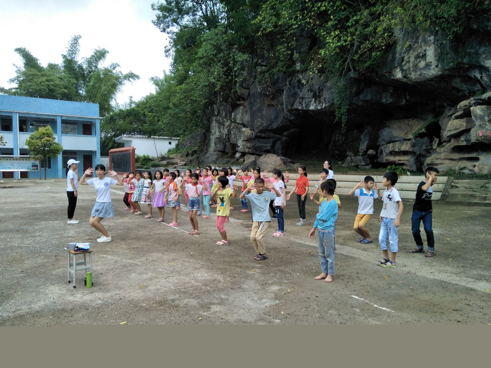 室内教学如此有趣,室外教学也同样欢快。操场上,三位小老师领着同学们跳起活力四射的健美操。动作不规范、同手同脚的孩子在得到小老师的纠正后也能有板有眼地完成一整套的健美操。看着孩子们脸上洋溢着灿烂的笑容,小老师们也成就感满满。