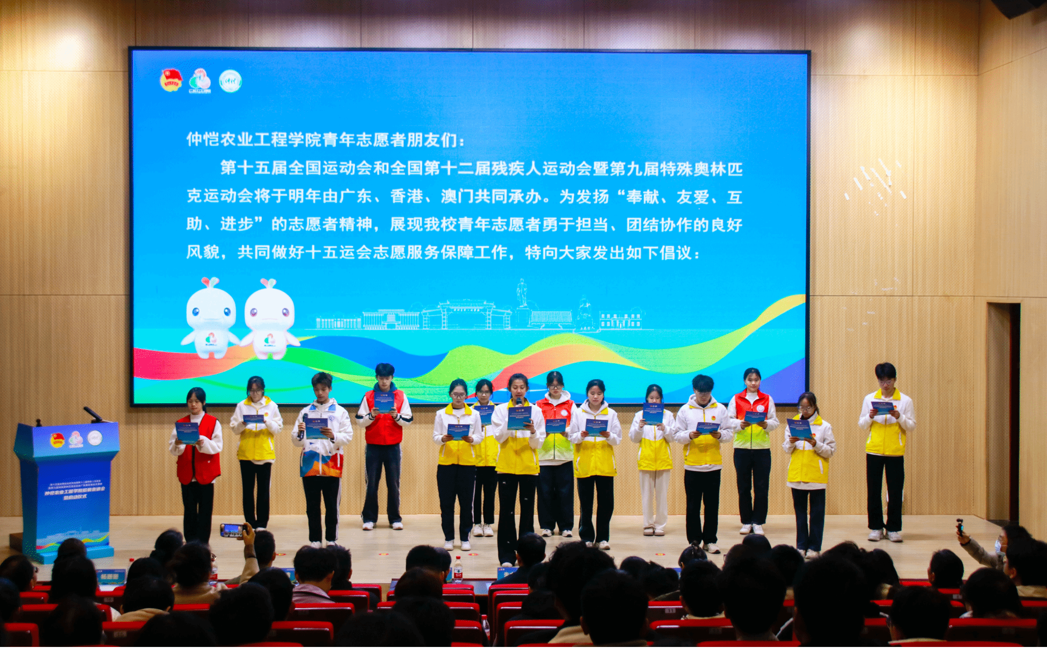 仪式上,校青年志愿者协会会长及各分会志愿者代表宣读倡议书,号召广大仲恺青年展现青春担当、履行岗位职责、厚植志愿精神,争当赛会志愿者、做好赛事保障者、成为文化传播者。