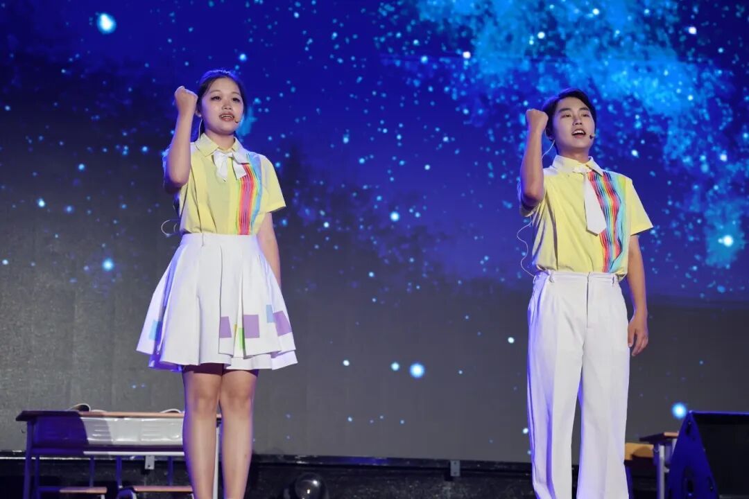 由蔡浩渝、林梓烁、洪东骏、陈畅航同学与校健美操队带来的歌伴舞《闪耀》,当青春的歌声遇见活力的舞步,舞台瞬间被点亮!跃动的旋律是梦想的节拍,矫健的舞姿是青春的写照!
