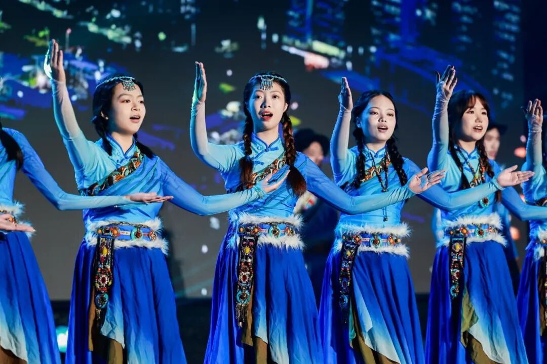 薛泽振、劳梓恒、邝楠、刘紫妍、陈简然同学与管理学院DC舞队联合呈现了歌伴舞《同心·共圆梦》,熟悉的歌声与激情的舞姿交织成最动人的宣言。