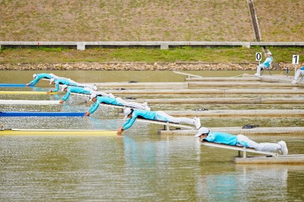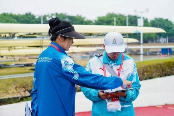 在广东国际划船中心,起点扶艇员是确保比赛公平的“第一道防线”。发令前,他们稳稳托举赛艇,与裁判密切配合,精准校准起航位置;比赛间隙,他们细心排查设施隐患,及时清理航道障碍,以高度的责任心守护着比赛的公平公正。