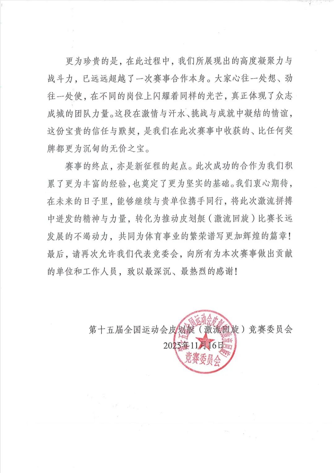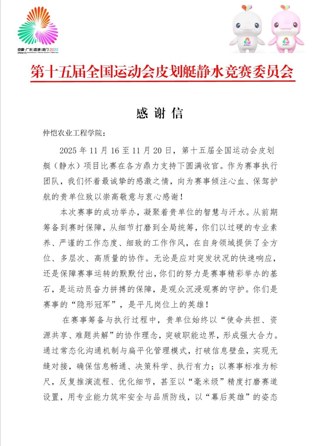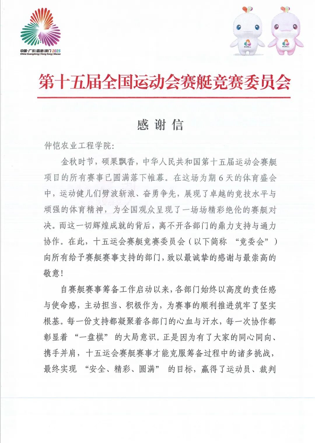 近日,第十五届全运会赛艇、皮划艇(静水)及皮划艇(激流回旋)竞赛委员会先后致信我校,高度肯定并感谢我校在三项赛事服务保障中的卓越贡献。在赛事准备和举办过程中,校团委以高度的责任感与使命感,主动担当、积极作为,配合竞委会和场馆方做好志愿者技能培训、岗位分配管理对接、后勤保障等工作。我校志愿者协助竞委会各个处室完成各项裁判和服务保障工作,确保运动员得到公平对待、赛事能够顺利进行、线上线下观众获得较好的观赛体验,获得了工作人员和观众的高度评价,践行了“为你,更精彩”的服务口号,更进一步体现“简约、安全、精彩”的办赛理念。