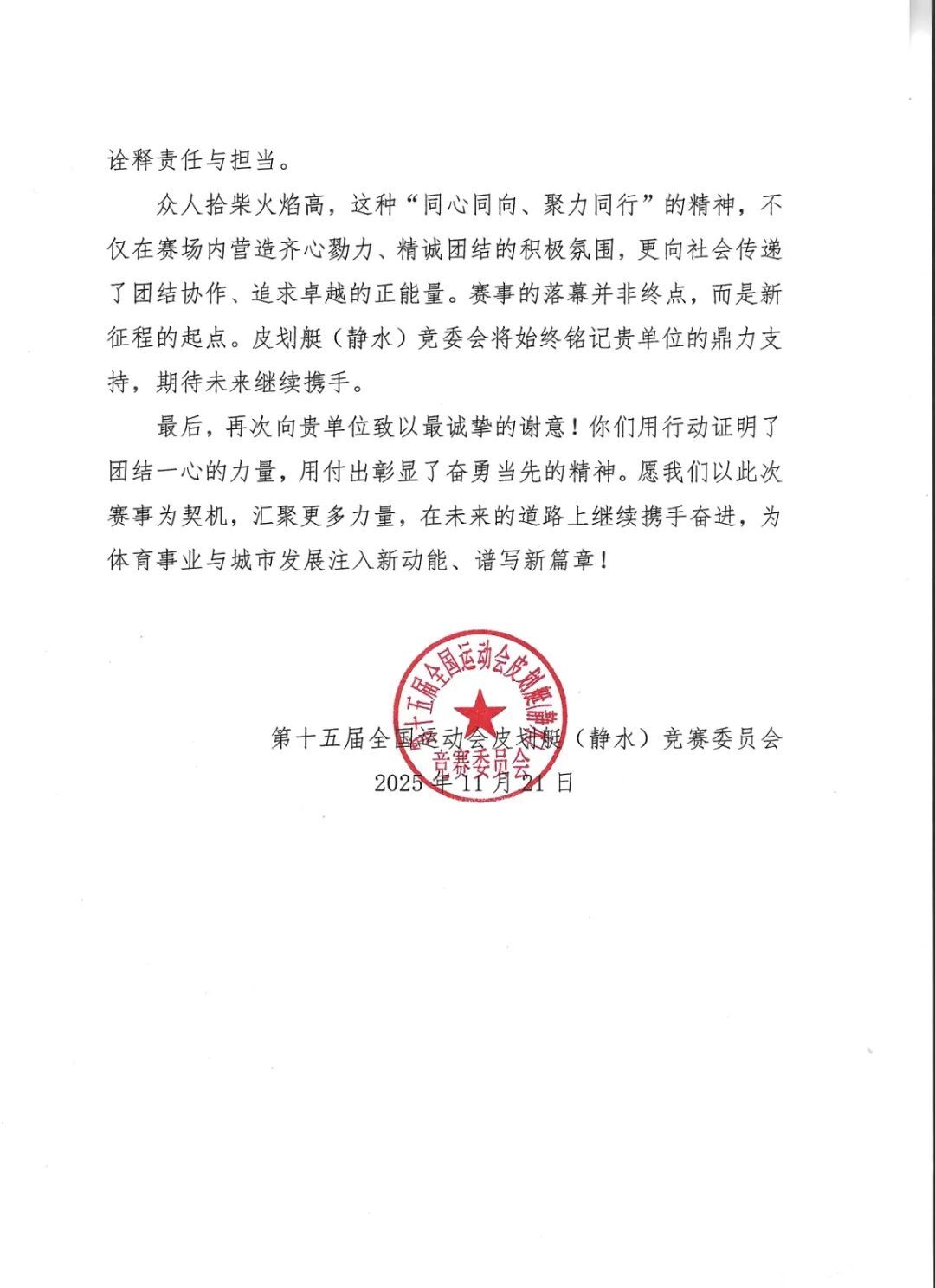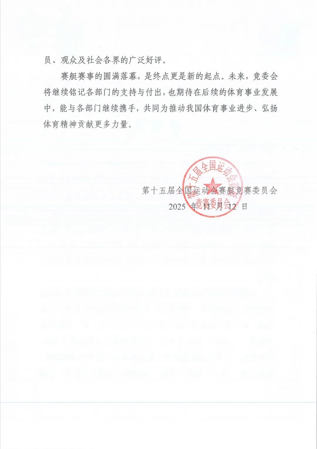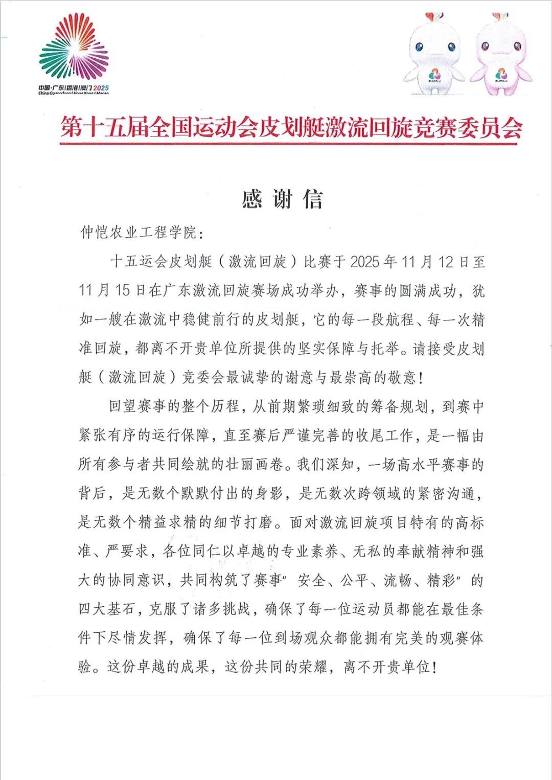 近日,第十五届全运会赛艇、皮划艇(静水)及皮划艇(激流回旋)竞赛委员会先后致信我校,高度肯定并感谢我校在三项赛事服务保障中的卓越贡献。在赛事准备和举办过程中,校团委以高度的责任感与使命感,主动担当、积极作为,配合竞委会和场馆方做好志愿者技能培训、岗位分配管理对接、后勤保障等工作。我校志愿者协助竞委会各个处室完成各项裁判和服务保障工作,确保运动员得到公平对待、赛事能够顺利进行、线上线下观众获得较好的观赛体验,获得了工作人员和观众的高度评价,践行了“为你,更精彩”的服务口号,更进一步体现“简约、安全、精彩”的办赛理念。