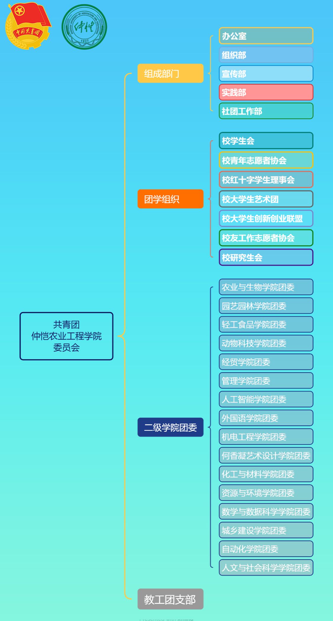 共青团仲恺农业工程学院委员会,简称“校团委”,在学校党委和团省委的领导下,承担着青年学生思想政治引领和服务青年成长成才的工作。目前设有办公室、组织部、宣传部、实践部、社团工作部五个部门,下辖16个二级学院团委和1个教工团支部。直属管理校学生会、校研究生会、校青年志愿者协会、校大学生艺术团、大学生创新创业联盟、校红十字学生理事会、校友工作志愿者协会七个校级学生组织。